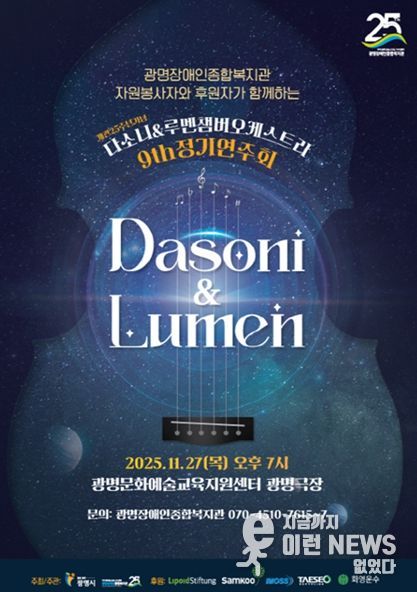 이런뉴스(e-runnews) 김삼성 기자 | 광명장애인종합복지관은 개관 25주년을 맞아 오는 11월 27일 오후 7시, 광명극장에서 ‘다소니&루멘챔버오케스트라 제9회 정기연주회’를 개최한다. 이번 연주회는 복지관을 위해 꾸준히 후원과 자원봉사를 실천해온 후원자와 자원봉사자를 초청해, 장애인 예술가의 무대를 함께 즐기는 감사의 자리로 마련됐다. 복지관은 이번 행사를 통해 지역사회가 장애예술을 보다 가까이 경험하고, 문화예술을 매개로 한 긍정적 인식 변화가 확산되기를 기대하고 있다.