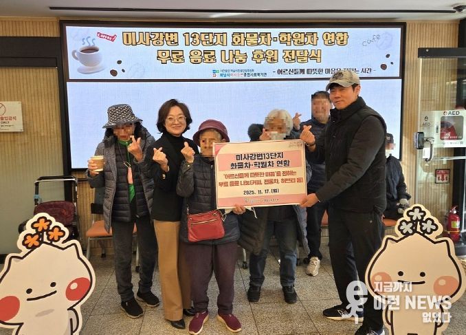 이런뉴스(e-runnews) 김삼성 기자 | 하남시미사강변종합사회복지관은 11월 17일 오전 10시부터 오후 5시까지, 미사강변 13단지 화물차·학원차 연합의 후원으로 복지관 내 ‘나눔카페’에서 지역 어르신들에게 커피, 전통차, 허브티 등 따뜻한 음료 400잔을 무료로 제공했다.