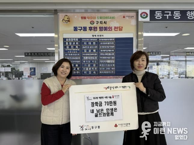 이런뉴스(e-runnews) 김삼성 기자 | 구리시 동구동 행정복지센터는 지난 18일 동구동 행정복지센터 대회의실에서 '내 남은 인생은 골프와 함께' 모임으로부터 관내 취약계층 청소년을 위한 장학금 70만 원을 기탁받았다고 밝혔다.