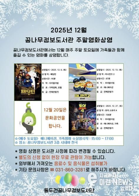이런뉴스(e-runnews) 김삼성 기자 | 동두천시 도서문화사업소 꿈나무정보도서관은 12월 매주 토요일 어린이와 가족을 위한 애니메이션 및 가족영화 3편을 상영한다고 밝혔다.
