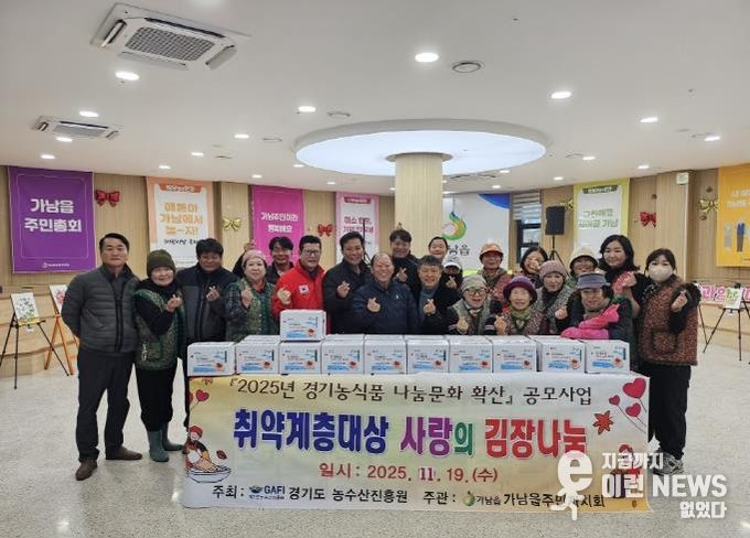 이런뉴스(e-runnews) 김삼성 기자 | 가남읍주민자치회는 11월 18일에서 19일 이틀간 가남읍 행복나눔센터 1층에서 ‘취약계층대상 사랑의 김장나눔’봉사를 개최했다. 이번 행사는 '2025년 경기농식품 나눔문화 확산' 공모사업의 일환으로 진행됐으며, 정성스럽게 담근 김장김치와 알타리김치를 관내 40개 마을의 홀몸어르신 80명에게 전달했다.