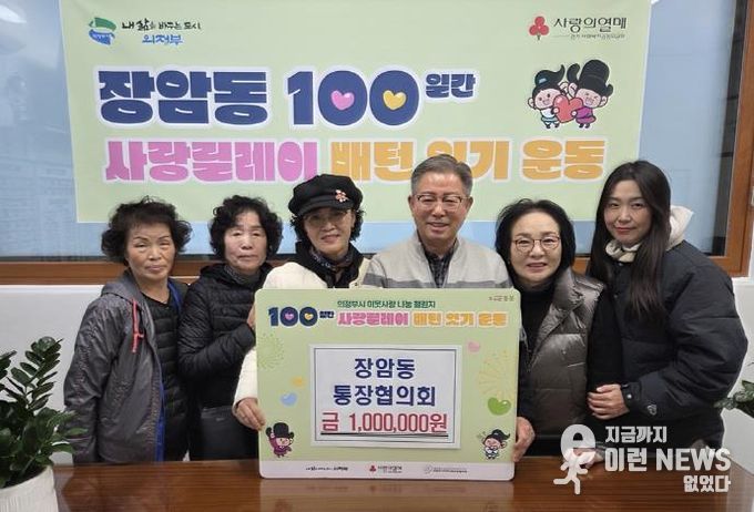이런뉴스(e-runnews) 김삼성 기자 | 의정부시 장암동주민센터는 11월 19일 장암동 통장협의회가 성금 100만 원을 전달하며 ‘100일간 사랑릴레이 배턴 잇기’에 힘을 보탰다고 밝혔다.