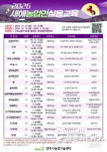 양주시농업기술센터 관계자는“새해농업인실용교육은 농업인의 현장 실천 능력을 높이는 핵심 프로그램으로, 변화하는 농업환경에 대비하고 지역농업 경쟁력을 강화하는 데 큰 도움이 될 것”이라고 말했다.