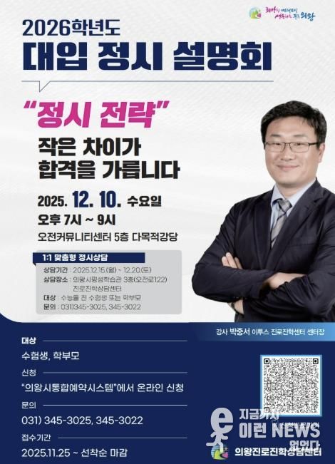 이런뉴스(e-runnews) 김삼성 기자 | 의왕시가 12월 10일 저녁 7시부터 오전커뮤니티센터 5층 강당에서 ‘2026학년도 대입 정시 지원전략 설명회’를 개최한다.