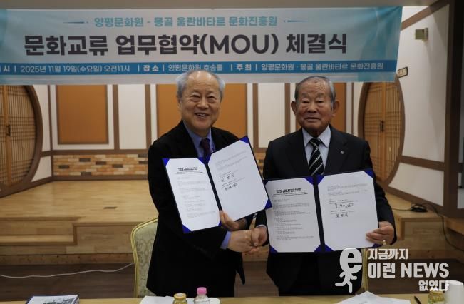 이런뉴스(e-runnews) 김삼성 기자 | 양평문화원은 양평문화원 호송홀에서 사단법인 몽골 울란바타르 문화진흥원과 문화교류 협력에 관한 양해각서를 체결했다.