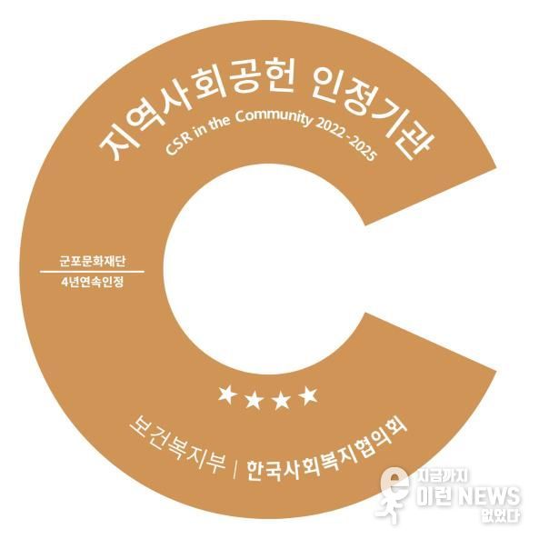 이런뉴스(e-runnews) 김삼성 기자 | 군포문화재단이 지역사회공헌 인정제 4년 연속 선정이라는 성과를 거두며, 지역사회 공익활동에서 지속성과 우수성을 다시 한 번 인정받았다. 이는 전국 문화재단 가운데 유일하게 4년 연속 선정된 사례이다.