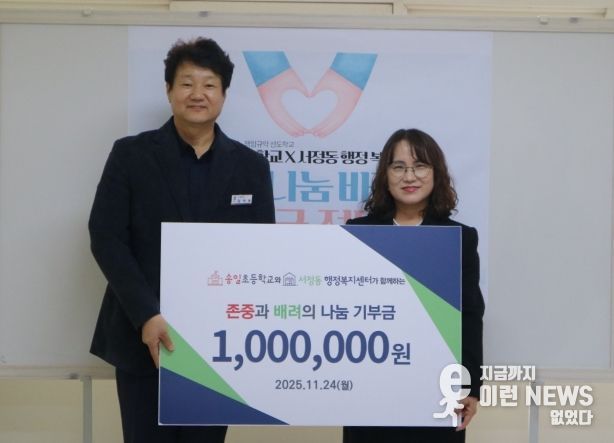 이런뉴스(e-runnews) 김삼성 기자 | 평택시 서정동 행정복지센터는 지난 24일 송일초등학교가 최근 진행한 학교 바자회를 통해 모금한 수익금 100만 원을 서정동 행정복지센터에 기부했다고 밝혔다.