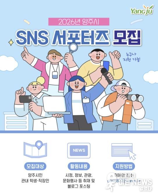 이런뉴스(e-runnews) 김삼성 기자 | 양주시가 시민과 소통하며 시정 소식과 지역의 숨은 매력을 널리 알릴 '2026년 양주시 SNS 서포터즈'를 오는 12월 1일부터 10일까지 10일간 모집한다.