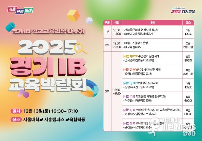 이런뉴스(e-runnews) 김삼성 기자 | 경기도교육청이 오는 12월 13일 도내 교원 및 교육전문직원을 대상으로 ‘2025 경기 아이비(IB) 교육박람회’를 개최한다. 학교 맥락에 기반한 ‘IB 교육’ 실천 사례 나눔으로 미래형 수업과 평가 일반화에 도움을 주고자 마련한 자리다.
