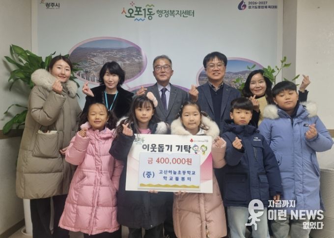 이런뉴스(e-runnews) 김삼성 기자 | 고산하늘초등학교 학교돌봄터 아이들은 3일 지역의 어려운 이웃을 위해 써달라며 오포1동에 성금 40만 원을 전달했다.