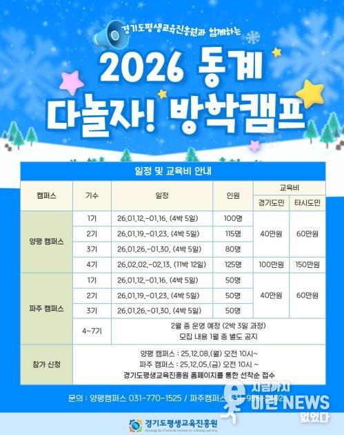 이런뉴스(e-runnews) 김삼성 기자 | 다가오는 겨울방학을 맞아 경기도평생교육진흥원이 경기미래교육캠퍼스에서 1~2월 한 달간 ‘다놀자! 방학캠프’를 운영한다. 전국 초등학교 3학년부터 중학교 1학년 학생이라면 누구나 참여할 수 있으며, 파주 캠퍼스는 12월 5일, 양평 캠퍼스는 8일부터 모집을 시작한다.