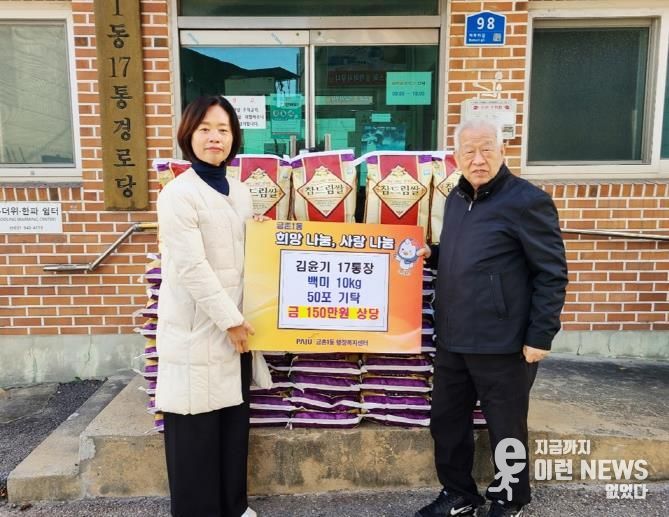 이런뉴스(e-runnews) 김삼성 기자 | 파주시 금촌1동은 3일 김윤기 금촌1동 17통장으로부터 150만원 상당 백미 10kg 50포를 기탁받았다고 밝혔다.