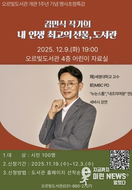 이런뉴스(e-runnews) 김삼성 기자 | 동두천시 도서문화사업소는 12월 9일 오르빛도서관에서 김민식 작가를 초청해 개관 1주년 기념 시민 강연을 개최한다. 강연은 ‘내 인생 최고의 선물, 도서관’을 주제로 오후 7시 도서관 4층 어린이자료실에서 진행된다.