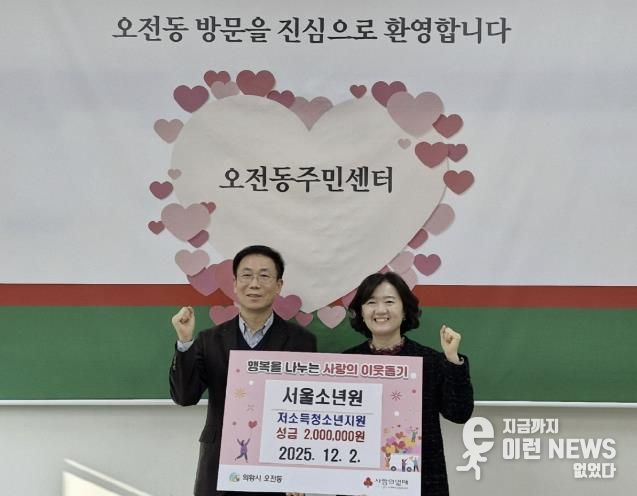 이런뉴스(e-runnews) 김삼성 기자 | 의왕시 서울소년원은 12월 2일, 오전동의 경제적 어려움을 겪는 청소년들을 지원하기 위해 장학금 200만 원을 오전동주민센터에 기탁하며, 지역사회에 따뜻한 손길을 전했다.