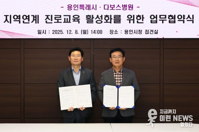 이날 이상일 시장과 양성범 다보스병원 이사장은 시청 시장접견실에서 ‘지역연계 진로교육 활성화를 위한 업무협약’을 맺었다.