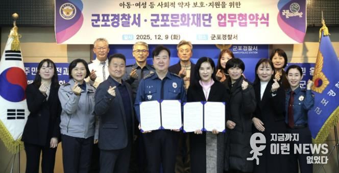 이런뉴스(e-runnews) 김삼성 기자 | 군포문화재단과 군포경찰서는 상호 교류와 협력을 바탕으로 지역사회의 홍보·안전·문화 향유를 지원하기 위해 12월 9일 업무협약(MOU)을 체결했다.