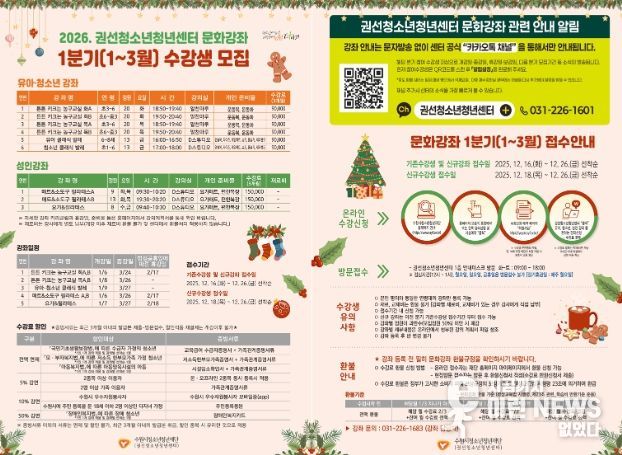 이런뉴스(e-runnews) 김삼성 기자 | 수원시청소년청년재단 권선청소년청년센터는 오는 1월 6일부터 3월 27일까지 지역사회 평생학습 문화강좌 1분기(1~3월) 수강생을 모집한다.