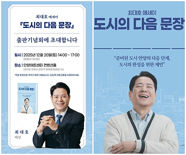 이런뉴스(e-runnews) 김삼성 기자 | 최대호 안양시장이 도시경영 철학을 담은 '에세이' 「도시의 다음 문장」을 출간하며, 오는 12월 20일(토) 오후 2시 안양아트센터 컨벤션홀에서 출판기념회를 개최한다.