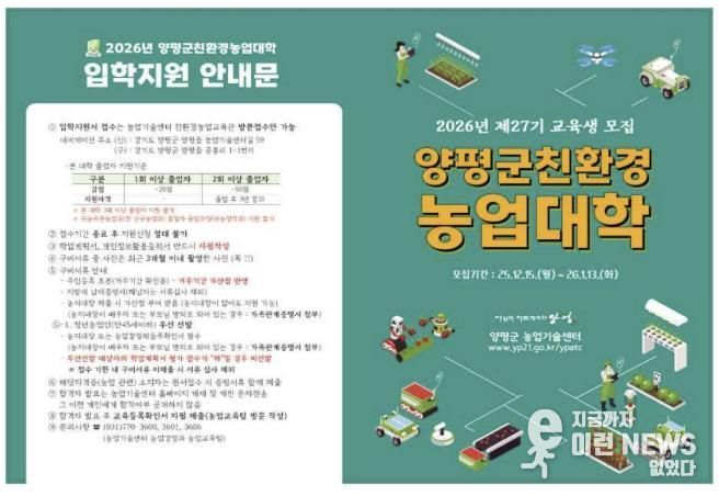 이런뉴스(e-runnews) 김삼성 기자 | 양평군은 15일부터 관내 농업인 및 군민을 대상으로 ‘2026년 제27기 양평군 친환경농업대학’ 신규 교육생을 모집한다고 밝혔다.