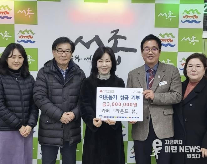 홍주표 서종면장은 “해마다 잊지 않고 소중한 성금을 기탁해 주셔서 깊이 감사드린다”며 “앞으로도 운영하시는 카페 라온드뷰가 더욱 발전하길 기원한다”고 감사의 뜻을 전했다.