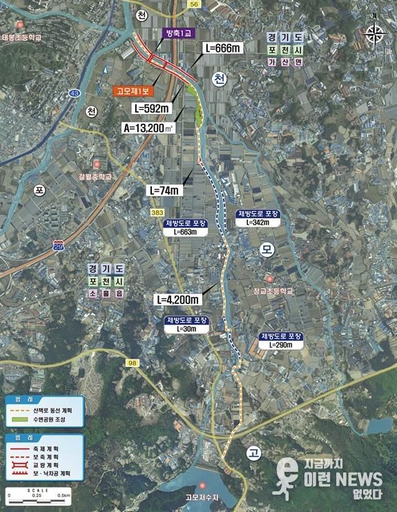 정비사업은 포천시 소흘읍 고모리에서 가산면 일원까지 총 연장 4.1km 구간을 대상으로 추진된다. 하천 제방 1.26km 보강을 통해 고모천의 홍수 대응 능력을 우선 개선하고 하천 유휴지를 활용하여 수변공원과 산책로를 조성해 주민들이 안전하게 이용할 수 있도록 하는 사업이다.