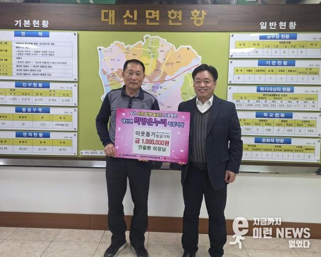 이상윤 대신면장은 “이웃을 먼저 생각하는 안출환 이장님의 따뜻한 마음에 깊이 감사드린다”며 “기탁해 주신 성금은 도움이 절실한 이웃들에게 소중히 전달하여, 지역사회에 온기가 퍼질 수 있도록 하겠다”고 말했다.