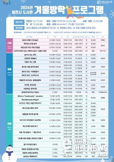 이런뉴스(e-runnews) 김삼성 기자 | 이천시는 2026년 1월부터 2월까지 겨울방학 기간에 어린이를 대상으로 한 다양한 독서문화 프로그램을 운영한다고 밝혔다.