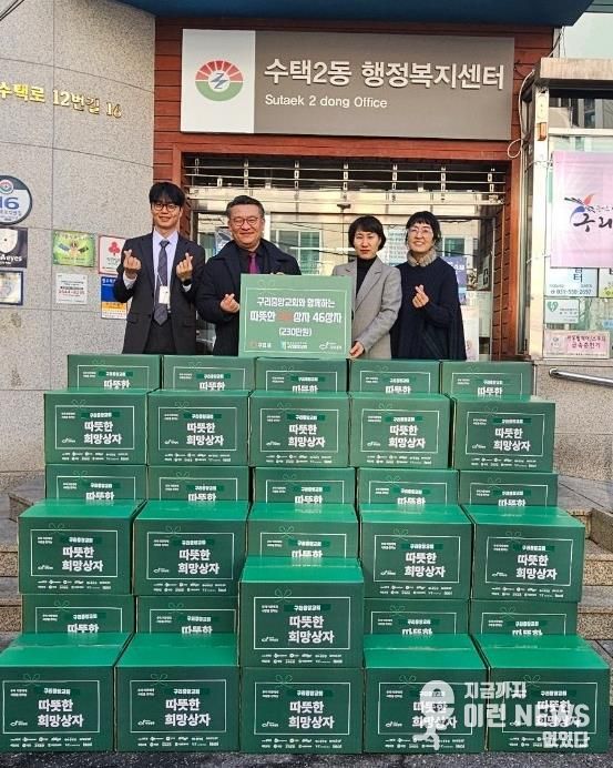 이런뉴스(e-runnews) 김삼성 기자 | 구리시 수택2동은 지난 12월 18일 지역사회 이웃사랑 실천의 하나로 구리중앙교회와 국제구호단체 ‘기아대책’이 함께 마련한 희망 상자 46박스를 전달받았다.