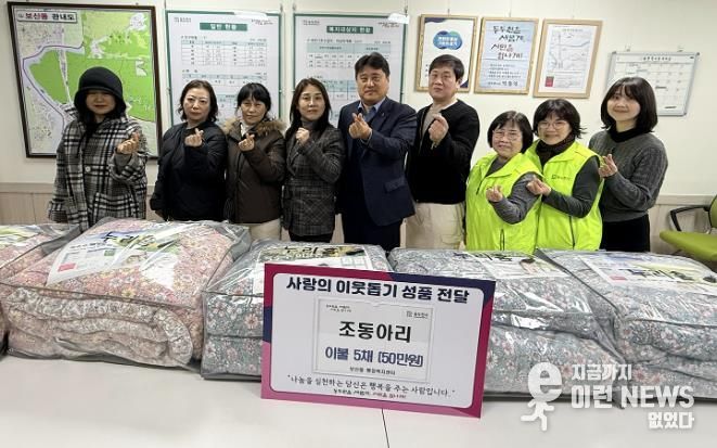 ‘조동아리(좋은 사람들이 모인 동아리 줄임말)’는 지역사회 봉사를 목적으로 결성된 모임으로, 연말 한파에 대비하지 못한 어려운 이웃들이 따뜻한 겨울을 보낼 수 있도록 회원들의 뜻을 모아 이번 후원을 진행했다. 이날 기탁된 이불은 보산동 내 저소득 취약계층 5가구에 전달될 예정이다.