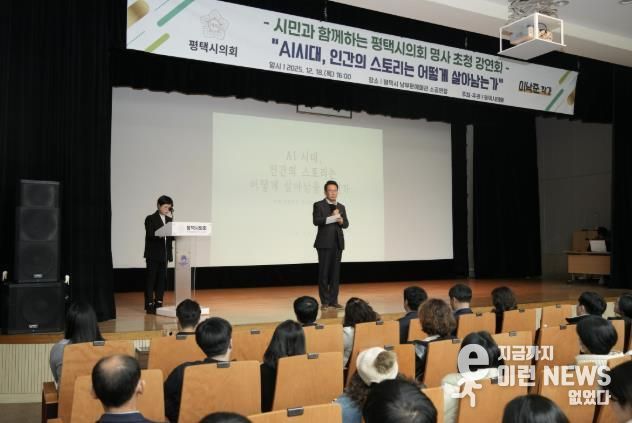 이런뉴스(e-runnews) 김삼성 기자 | 평택시의회는 12월 18일, 평택시 남부문화예술회관 소공연장에서 명사를 초청해‘AI시대, 인간의 스토리는 어떻게 살아남는가’를 주제로 강연회를 열었다.