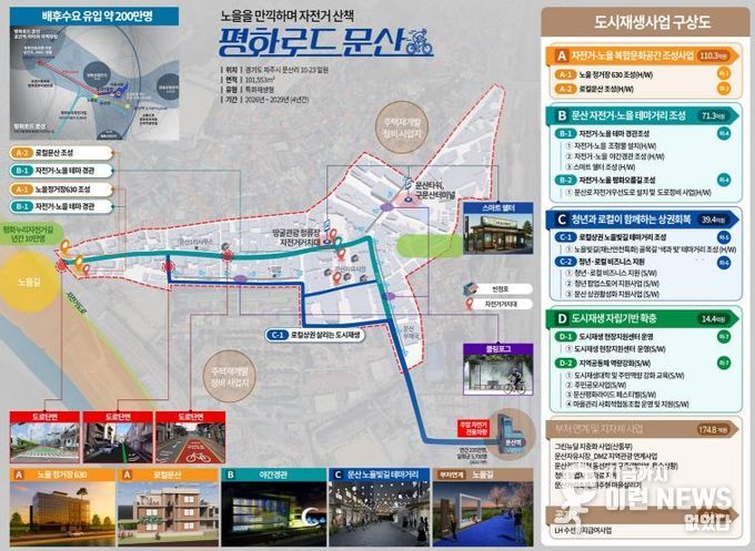 시는 문산천의 노을 경관과 수변을 따라 문산역과 디엠지(DMZ) 평화누리길로 이어지는 자전거길, 쉼터를 결합한 복합문화공간과 평화를 주제로 한 특화 거리를 조성하는 한편, 주민과 상인, 청년들의 협력을 기반으로 침체된 상권을 되살려 지속 가능한 도시재생 자립 기반을 다져나간다는 구상이다.