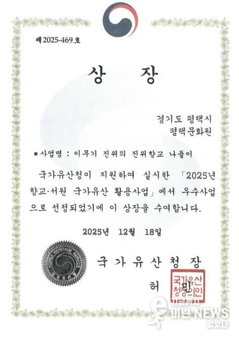 이런뉴스(e-runnews) 김삼성 기자 | 평택문화원은 12월 18일 대전 전통나래관 다목적강당에서 열린 국가유산청 주최 ‘2025 우리고장 국가유산 활용 우수사업 시상식’에서 평택문화원의 ‘이무기 진위의 진위향교 나들이’가 우수사업(국가유산청장상)으로 수상했다.