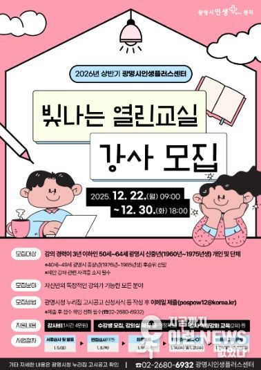 이런뉴스(e-runnews) 김삼성 기자 | 광명시는 오는 30일까지 ‘2026년 상반기 빛나는 열린교실’에 참여할 신중년 아마추어 강사를 모집한다.