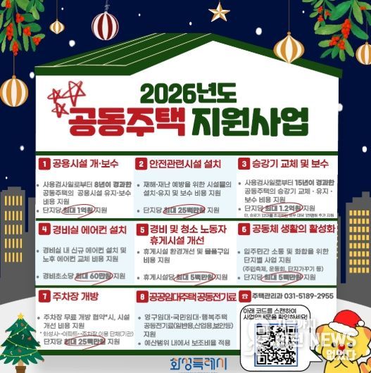 앞서 시는 안전하고 쾌적한 환경 조성을 위한 시민의 비용 부담 절감을 위해 지난해 12월 ‘화성시 공동주택관리 조례’를 개정해 ‘2025년도 공동주택 지원사업’의 대상과 범위를 확대한 바 있다.