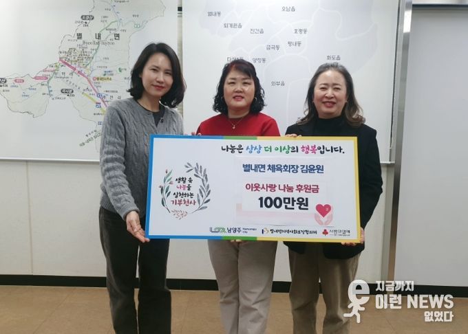이런뉴스(e-runnews) 김삼성 기자 | 남양주시는 지난 19일 김윤원 별내면 체육회장이 지역 내 취약 가구 지원을 위해 이웃사랑 성금 100만 원을 별내면 지역사회보장협의체에 기탁했다고 22일 밝혔다.