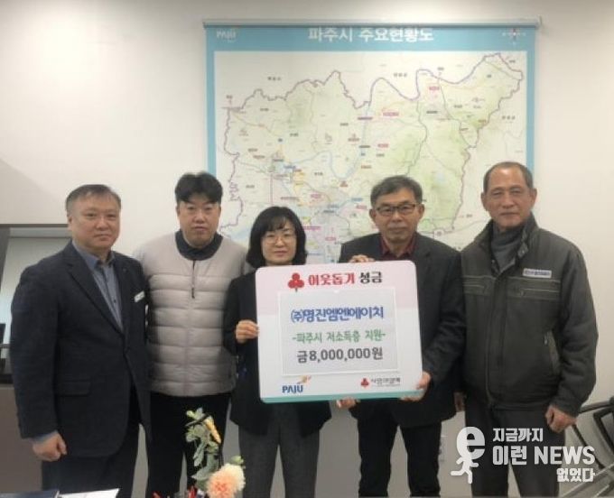 이런뉴스(e-runnews) 김삼성 기자 | 파주시는 지난 22일 관내 전문건설업체인 ㈜명진엠엔에이치로부터 불우이웃 돕기 성금 800만 원을 기탁 받았다고 밝혔다.