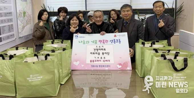 이강여 영통3동장은 “어려운 이웃을 위해 따뜻한 나눔을 실천해주신 아모리움 자원봉사 단체에 깊이 감사드린다. 관내 취약계층을 위한 다양한 지원이 지속적으로 이루어질 수 있도록 힘쓰겠다”고 말했다.