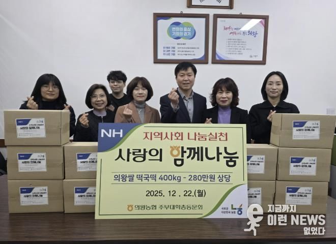 이런뉴스(e-runnews) 김삼성 기자 | 의왕농협 주부대학총동문회는 12월 22일, 회원들의 뜻을 모아 떡국떡 400kg(280만원 상당)을 부곡동주민센터에 기탁하며 어려운 이웃을 위한 나눔을 실천했다.