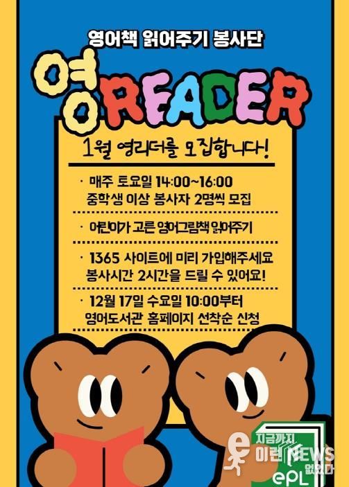 이런뉴스(e-runnews) 김삼성 기자 | 의정부영어도서관은 2026년 1월부터 영어책 읽어주기 봉사단 ‘영리더’가 참여하는 재능기부 프로그램 ‘Please Read a Book’을 운영한다.