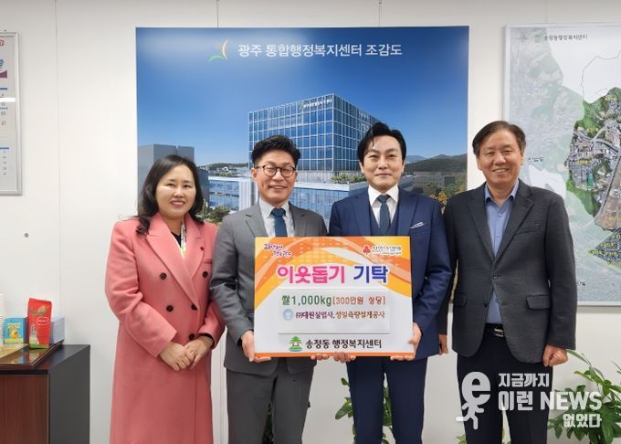 이런뉴스(e-runnews) 김삼성 기자 | ㈜대원실업사 이찬호 대표와 성일측량설계공사 문병훈 대표는 23일 광주시 송정동 행정복지센터를 방문해 지역 내 취약계층을 위해 쌀 1천㎏(300만 원 상당)을 기탁했다.