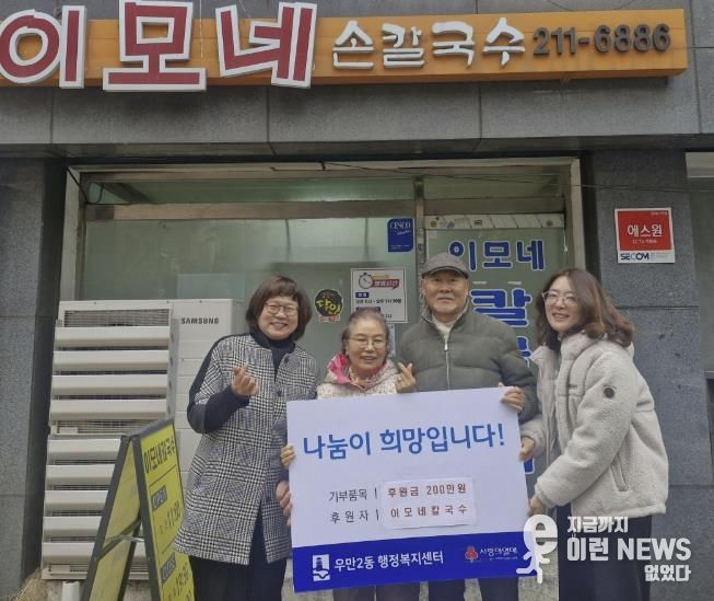 최영문 우만2동장은 “경기가 좋지 않음에도 해마다 후원을 이어오는 것이 결코 쉬운 일이 아니다”라며 “이모네칼국수의 따뜻한 나눔이 지역사회에 큰 울림을 주고 있으며, 홀몸어르신 복지 향상에 실질적인 도움이 되고 있다”고 감사의 뜻을 밝혔다.