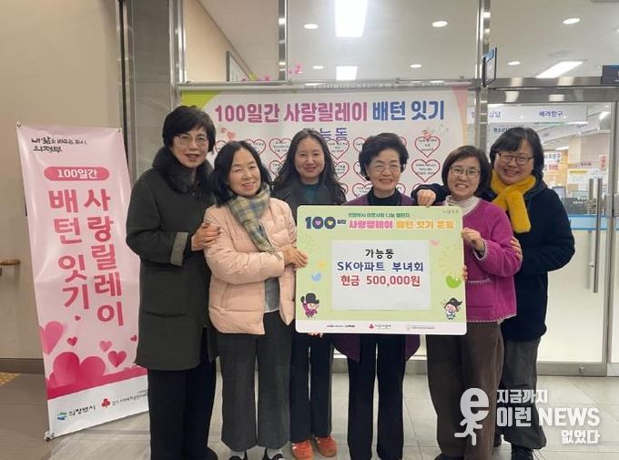 이런뉴스(e-runnews) 김삼성 기자 | 의정부시 가능동주민센터는 12월 22일 SK뷰아파트부녀회가 관내 저소득 가구를 돕기 위해 성금 50만 원을 기탁하며 ‘100일간 사랑릴레이 배턴 잇기’에 동참했다고 밝혔다.