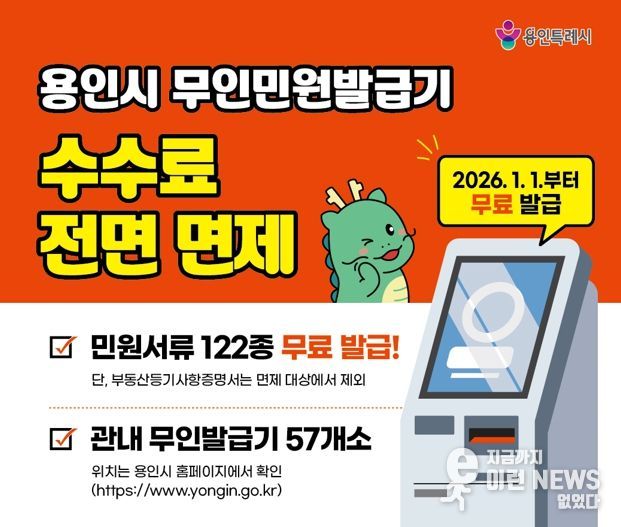 이런뉴스(e-runnews) 김삼성 기자 | 용인특례시는 2026년 1월 1일부터 지역 내 설치된 무인민원발급기에서 발급되는 민원서류 수수료를 전면 면제한다고 25일 밝혔다.