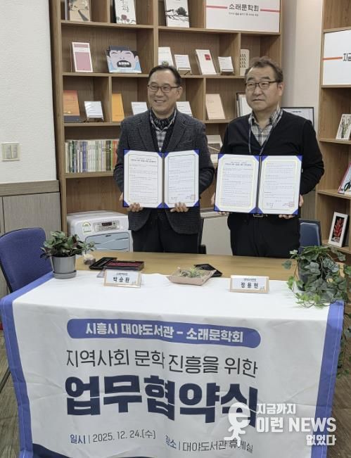 이런뉴스(e-runnews) 김삼성 기자 | 시흥시 대야도서관은 지역 문학단체인 소래문학회와 지난 12월 24일, 대야도서관 휴게실에서 지역 문학 진흥 및 독서문화 확산을 위한 업무협약을 체결했다.