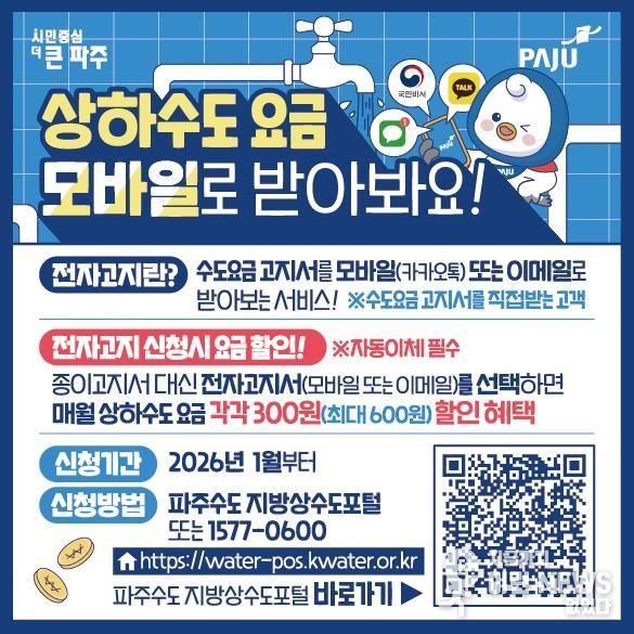 이런뉴스(e-runnews) 김삼성 기자 | 파주시는 2026년 1월부터 수도요금 전자고지와 자동납부를 동시에 신청하는 시민에게 수도요금을 할인하는 제도를 시행한다고 밝혔다.