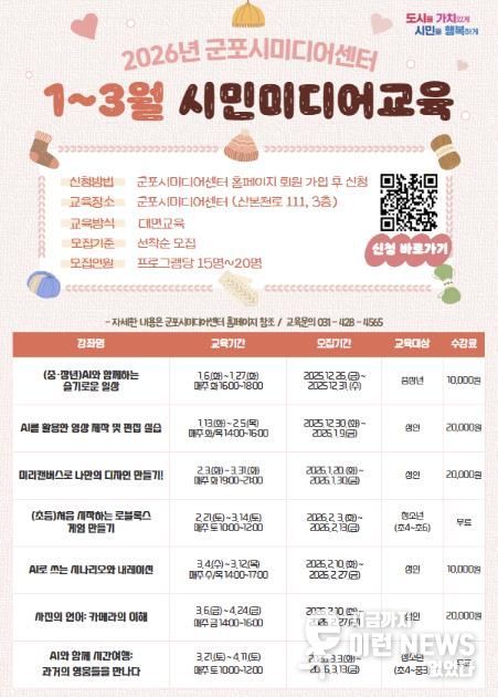 이런뉴스(e-runnews) 김삼성 기자 | 군포시미디어센터는 시민들의 미디어 활용 역량 강화를 위해 2026년 1분기 미디어교육 프로그램 수강생을 모집한다.