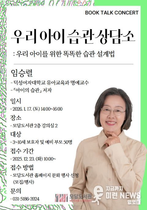 이런뉴스(e-runnews) 김삼성 기자 | 김포시 모담도서관이 2026년 1월 17일 토요일 14시부터 16시까지 3~10세 부모 및 예비 부모를 대상으로 한 상담형 프로그램 '우리 아이 습관 상담소'를 운영한다.