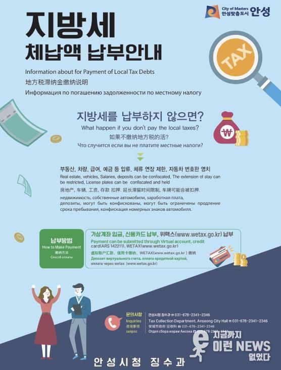 지난달 기준, 안성시의 외국인 지방세 체납자는 1,014명, 체납액은 2억 7천여만 원에 달한다. 이에 따라 시는 거소지가 불확실하거나 납부 의지가 없는 외국인 체납자 723명에 대하여 외국인 전용보험 자료를 조회 의뢰한 후, 15명에 대하여 압류 조치를 시행했다.