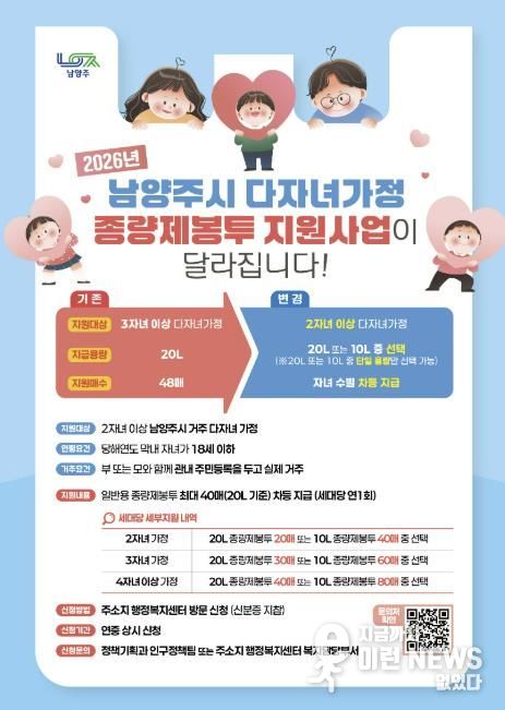이런뉴스(e-runnews) 김삼성 기자 | 남양주시는 내년 1월부터 ‘다자녀가정 종량제봉투 지원사업’ 대상을 2자녀 이상 가정으로 확대 운영한다고 26일 밝혔다.