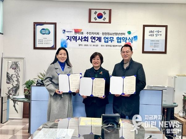 이런뉴스(e-runnews) 김삼성 기자 | 수원시청소년청년재단(이사장 최종진) 천천청소년청년센터는 수원시 정자3동 행정복지센터, 주민자치회와 지역사회 연계 활성화를 위한 업무협약을 12월 26일 체결했다고 밝혔다.